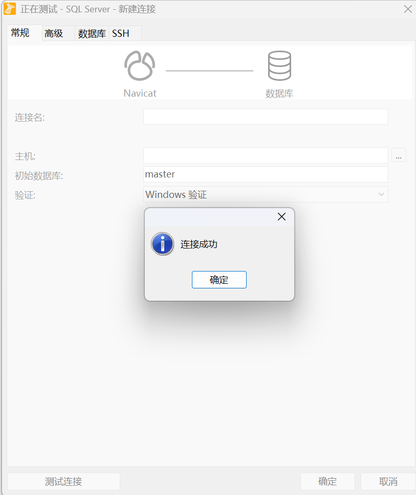net stop mssqlserver在Navicat中连接->SQL server->测试链接,如果出现如下图片则代表链接成功: